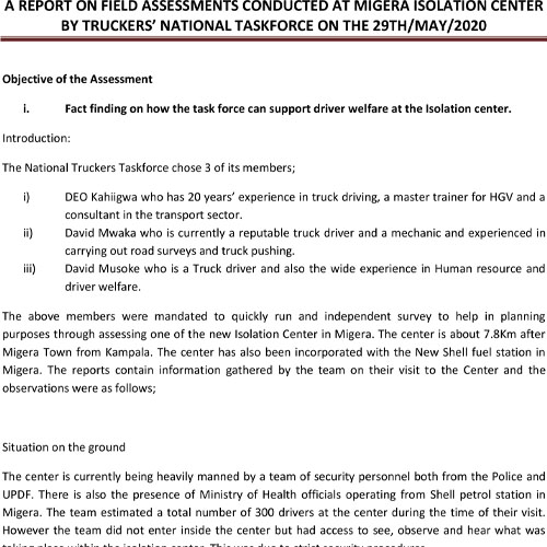 A REPORT ON FIELD ASSESSMENTS CONDUCTED AT MIGERA ISOLATION CENTER BY TRUCKERS’ NATIONAL TASKFORCE ON THE 29TH/MAY/2020
